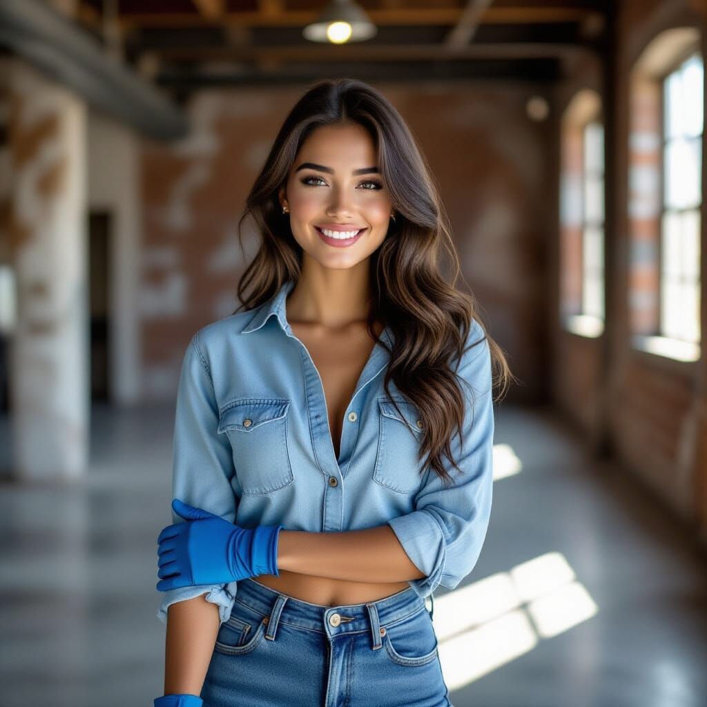 This image shows a beautiful young woman with striking aquamarine eyes and a warm smile, posing in a minimalist loft. She is wearing a blue satin top, dark denim jeans and blue leather gloves, styled as a hyperrealistic photograph.