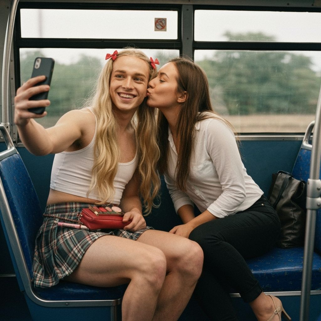 A young man with long blonde hair, wearing a plaid miniskirt and heels, takes a selfie with his girlfriend on a bus. Cinematic film still with atmospheric lighting and film grain.