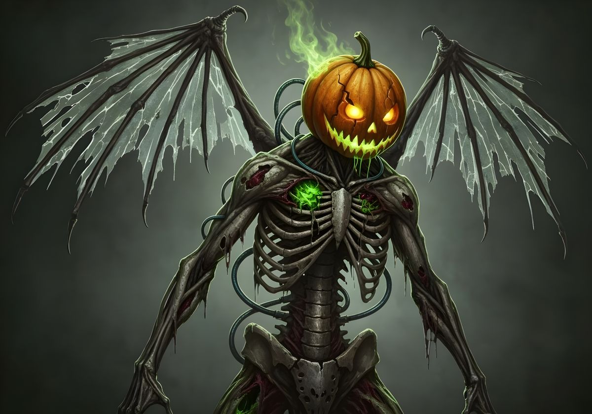 A monstrous, tattered-winged pumpkin demon with a skeletal, decayed body, its cracked jack-o’-lantern head glowing with sickly green fire. Veins of biomechanical tubing snake through its ribs and spine, merging with rotting flesh and rusted metal. The creature’s ragged wings drip with shadows and torn sinew, stretching into the darkness like broken cathedral glass. Its hollow eyes blaze with an otherworldly orange glow, casting eerie light across its twisted form. Rendered in a gothic horror dark fantasy style with biomechanical surrealism, dripping atmosphere, chiaroscuro lighting, and nightmarish detail.