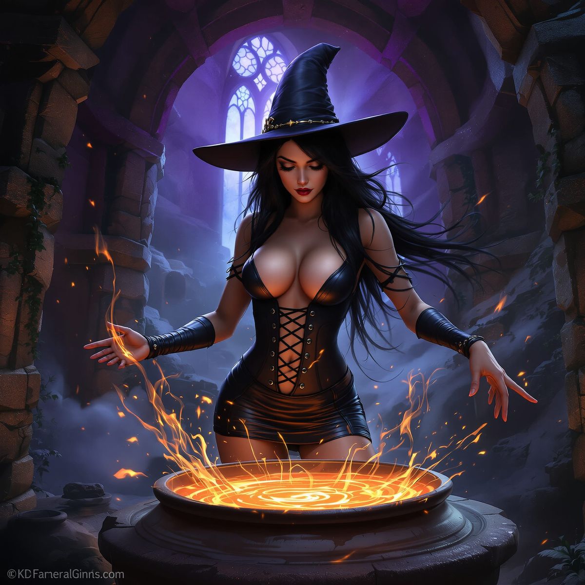 This image shows a brunette witch with long black hair casting a spell over a swirling cauldron in her tower. Rendered as detailed fantasy concept art with deep colors and intricate detail.
