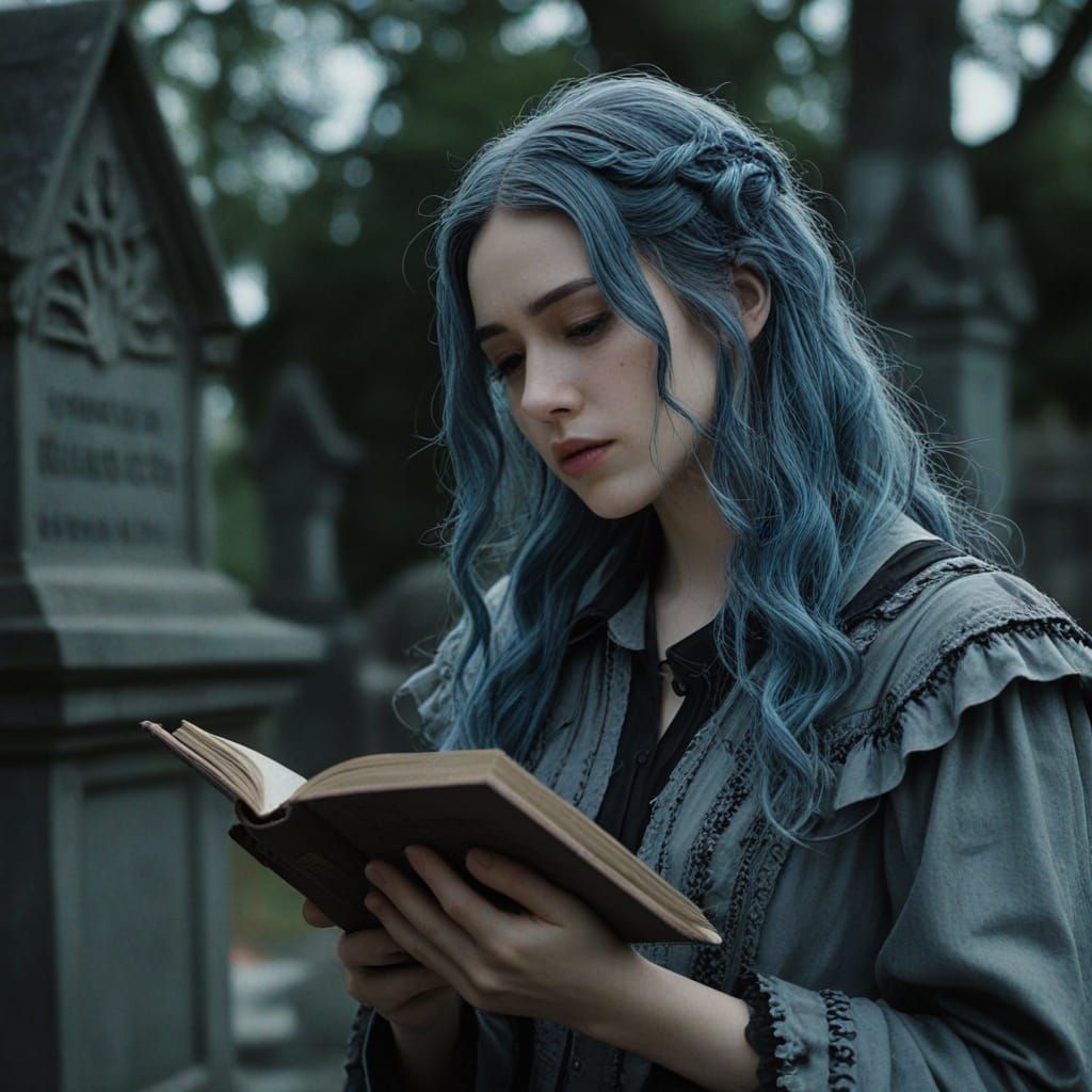 This image shows a gothic woman with blue hair holding a book in a graveyard, surrounded by tombstones. The scene is rendered in an anime-inspired gothic horror style, with soft light and deep blues and grays.