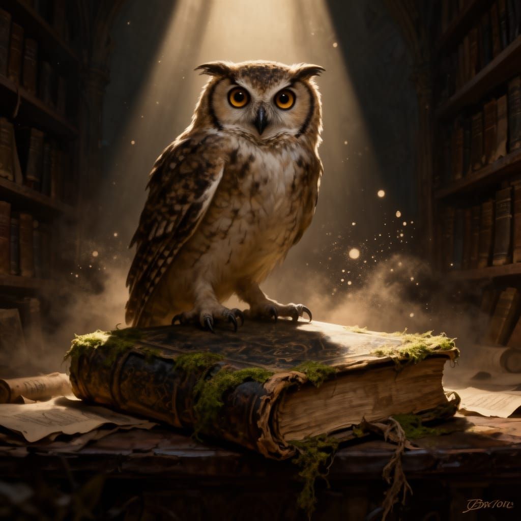 A wise owl sits on an old book in a dark library, illuminated by moonlight. This digital matte painting features a rich, dark palette and dramatic lighting, creating an arcane mystery.
