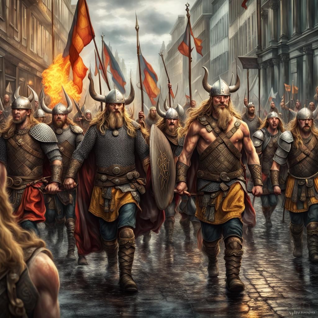 This image shows a Viking army parading through a conquered city, brandishing flaming banners and pagan idols. Spears are raised high, as pride and triumph fill the atmospheric, cinematic scene.
