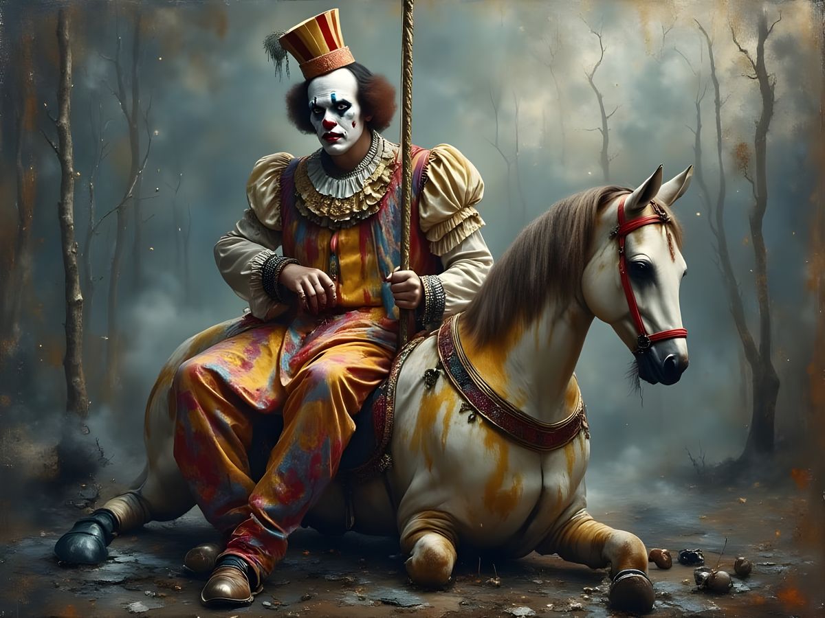 A poignant image of a clown with tear-streaked face on a deserted carousel horse. The scene is set under a stormy twilight sky, with flickering light creating an eerie yet touching atmosphere.