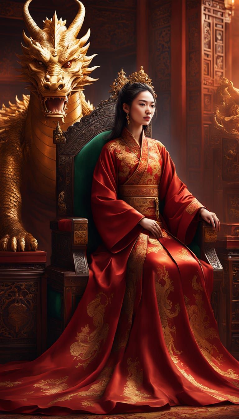 A striking portrait of a dragon princess in a Chinese throne room. The figure is adorned in a luxurious red silk robe with golden accents, all rendered as hyper-realistic digital art.