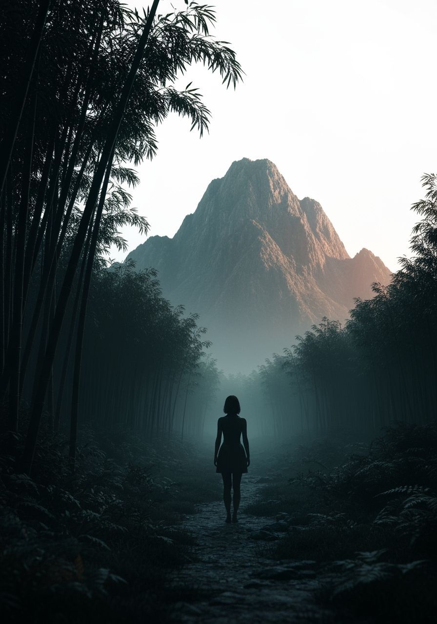 This image shows a ground-level shot of an Asian woman in metal attire, her figure filled with a double exposure of dark mountains and a bamboo forest. The artwork has a glitch art style and intricate mech details, set against a white backdrop, rendered as futuristic sci-fi art.