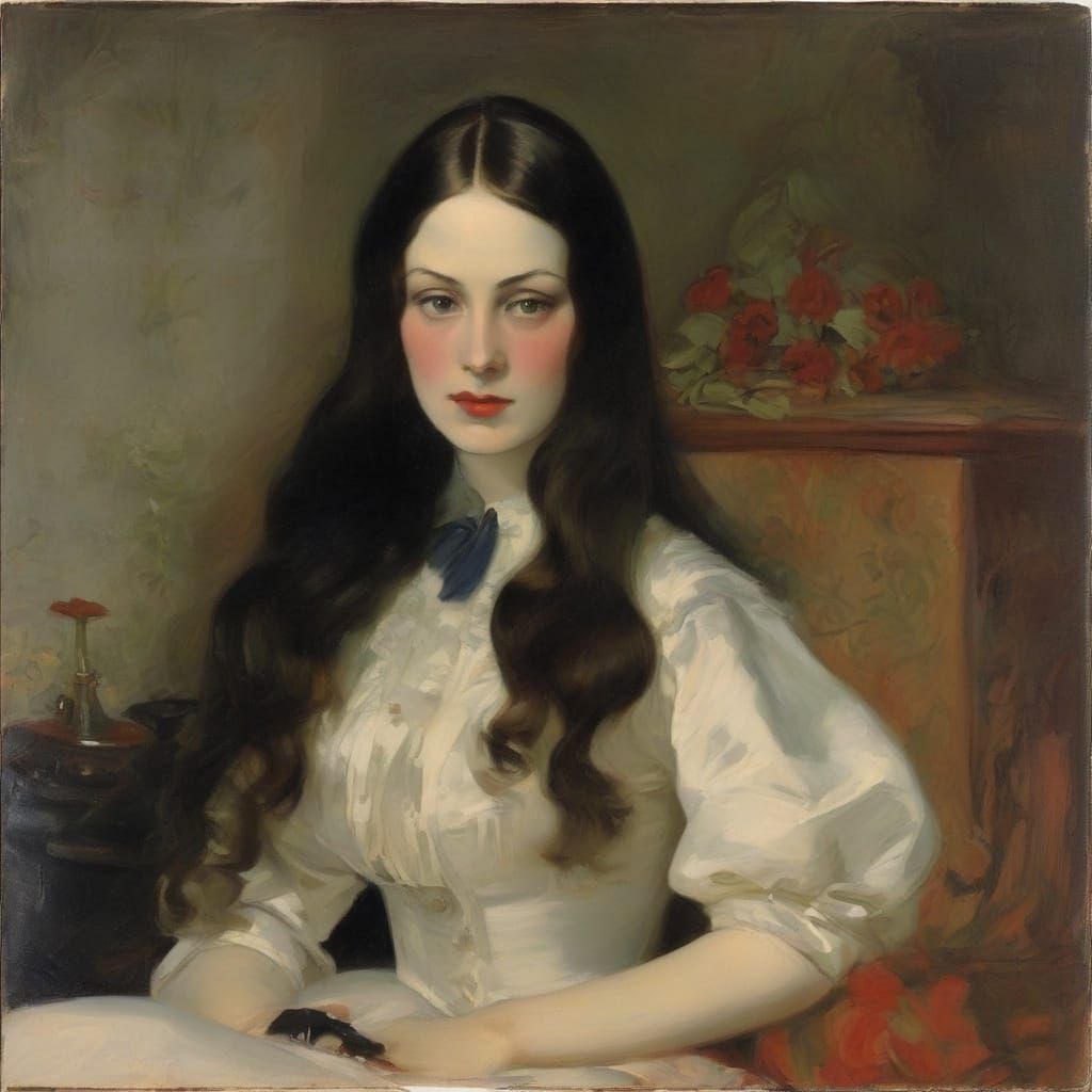 This image is a modern reinterpretation of a classic vampire theme, blending elements of Russian art with a contemporary twist. A mysterious woman with an otherworldly aura, reminiscent of the works of Konstantin Somov and Zinaida Serebriakova, is depicted in a dreamlike setting.