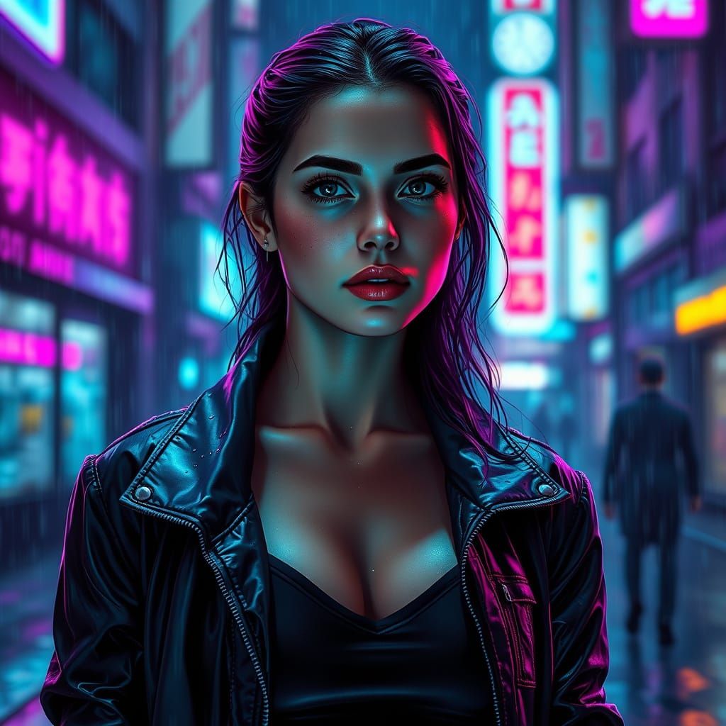 A striking image of a woman in tight, wet clothes standing in pouring rain within a neon-lit cyberpunk city. Features atmospheric lighting and a moody color palette.