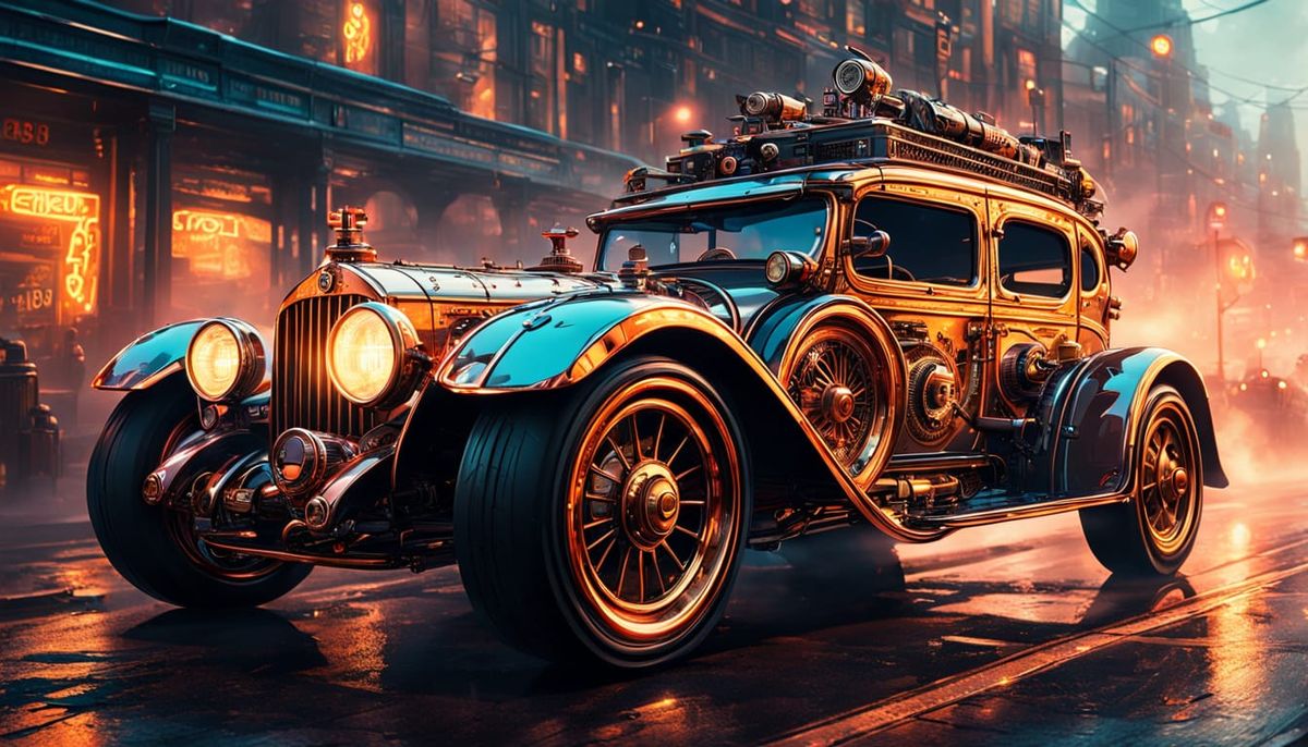 A striking picture of a futuristic steampunk car driving through a city. Copper gears shine, neon lights reflect, and smoke and mist swirl around the vehicle, as comic book art.