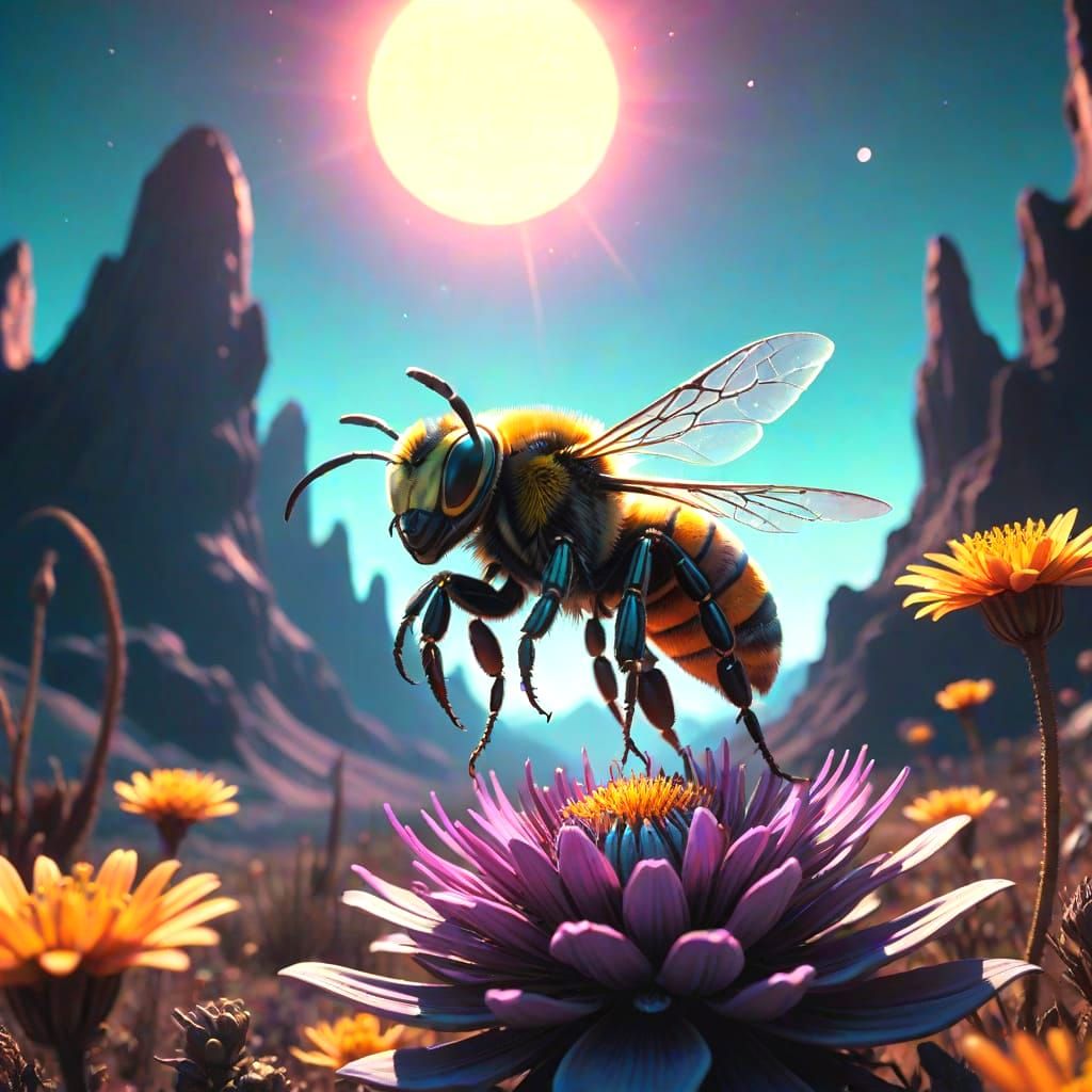 This image is a cinematic film still of a bee in a stunning, atmospheric landscape on a distant world, captured with cinematic lighting and a 35mm film aesthetic.