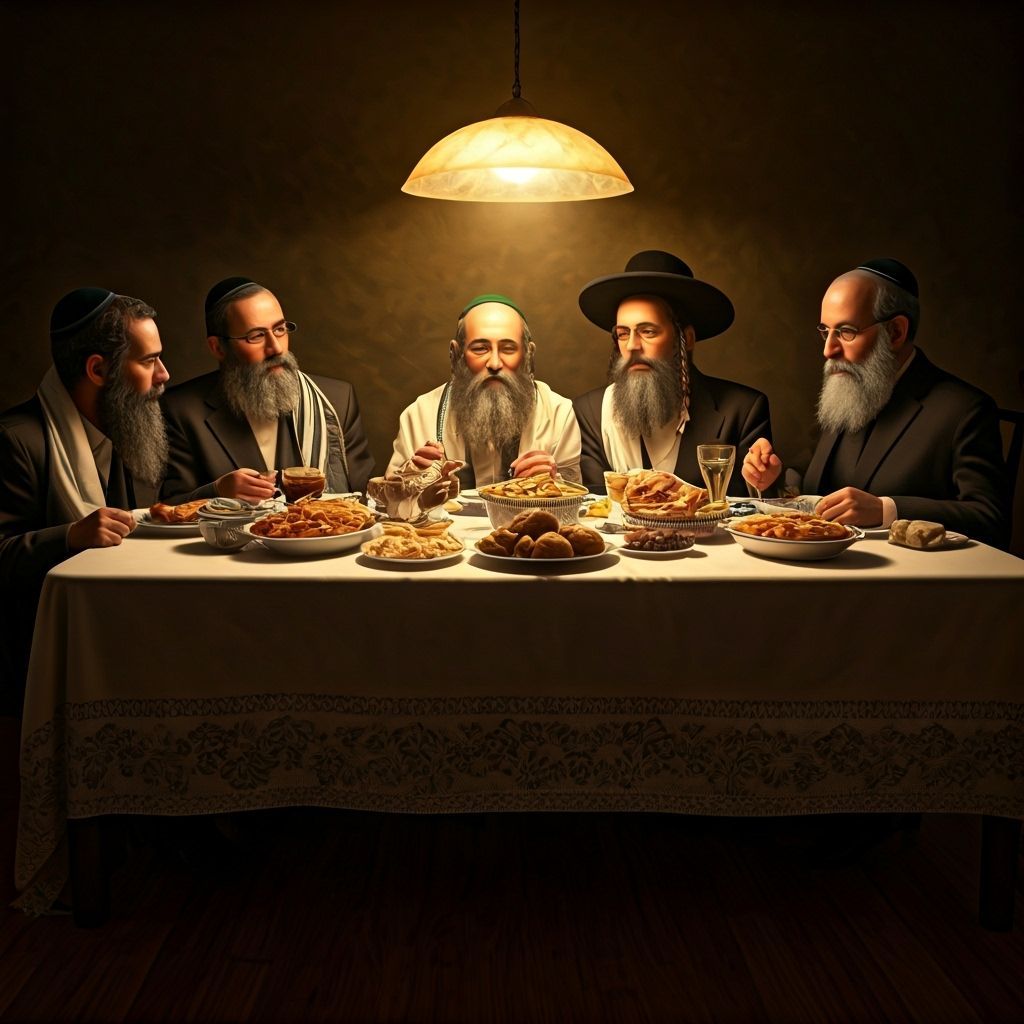 This image shows a Haredi Jewish family gathered for Shabbat. The table is full of traditional foods, illuminated by warm lighting in the style of Rembrandt. It shows deep spirituality and cultural heritage.