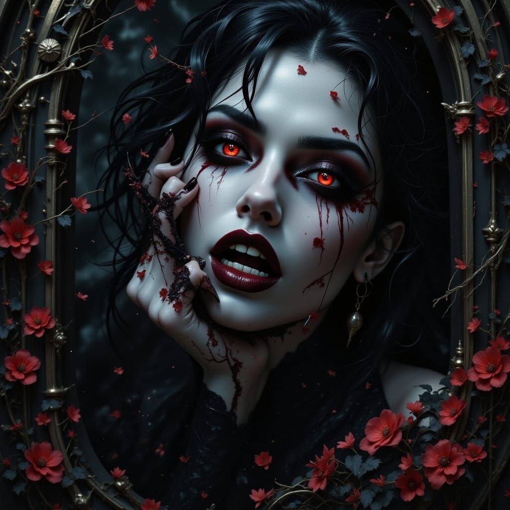 A photorealistic, 8k masterpiece gothic horror portrait of a female vampire. Features dramatic lighting, pale skin, red eyes, and menacing allure.