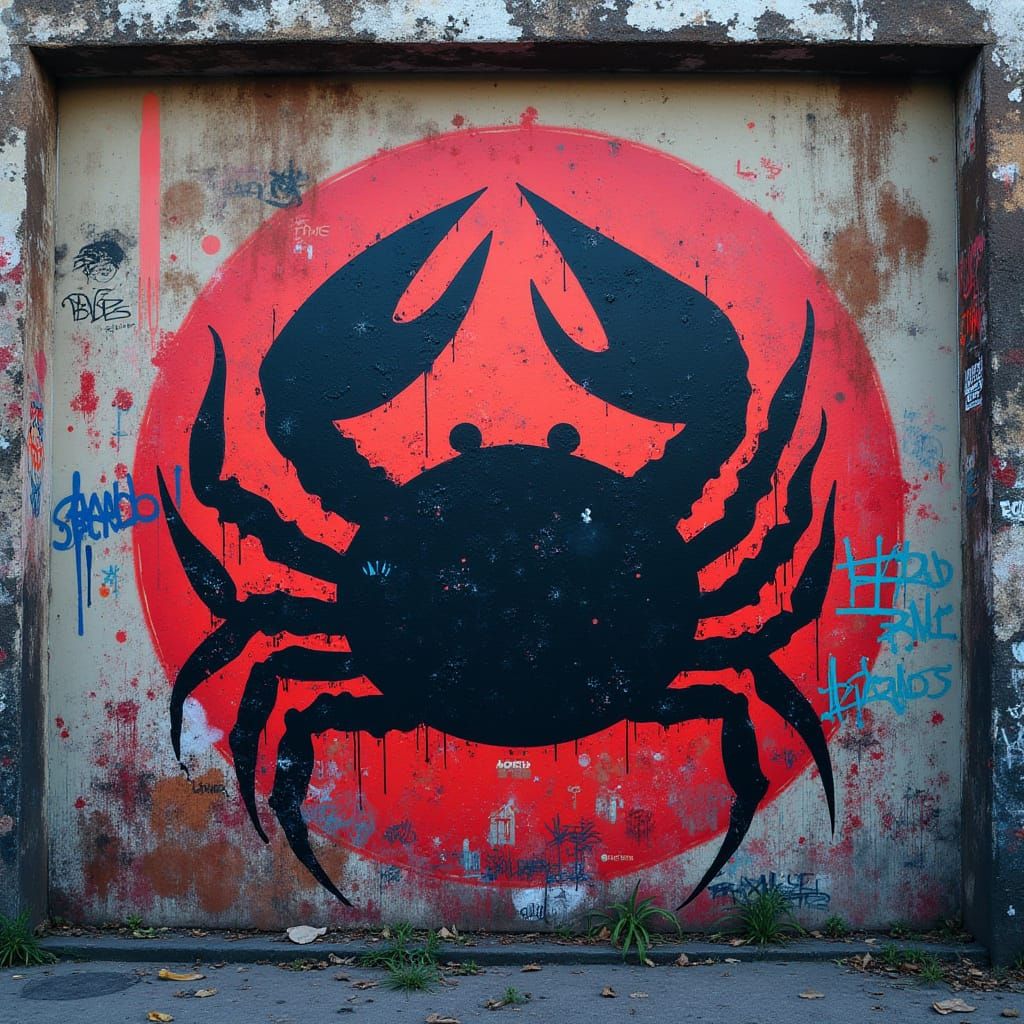 This image depicts the Cancer Zodiac silhouette in bold, black street calligraphy on a graffiti-strewn city wall, surrounded by intricate tags and ornate details in a vibrant, high-contrast aesthetic inspired by anime art.