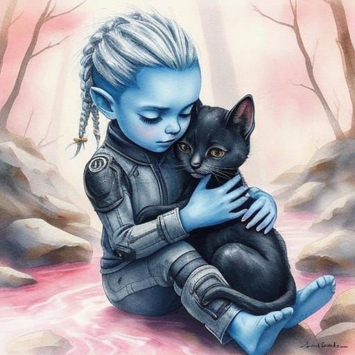 This watercolor art shows a young blue alien girl with silver hair embracing a robotic cat. Set by a pink stream in an ethereal alien forest with iridescent mist.