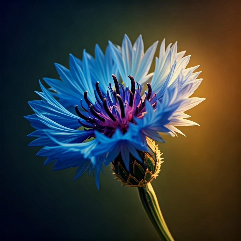 This image shows a detailed macro shot of a cornflower head bathed in sunlight. The vibrant colors and intricate details are rendered in a hyperrealistic style, reminiscent of concept art.