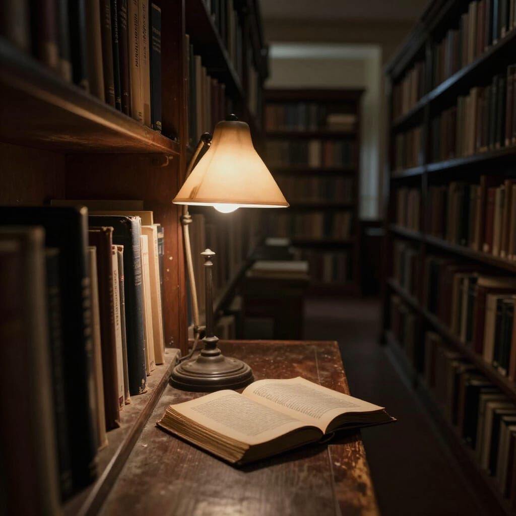 Cinematic film still of a dimly lit library aisle, with warm desk lamp beams casting shadows on dusty bookshelves and an open novel, evoking scholarly passage. Realistic textures and a melancholic mood.