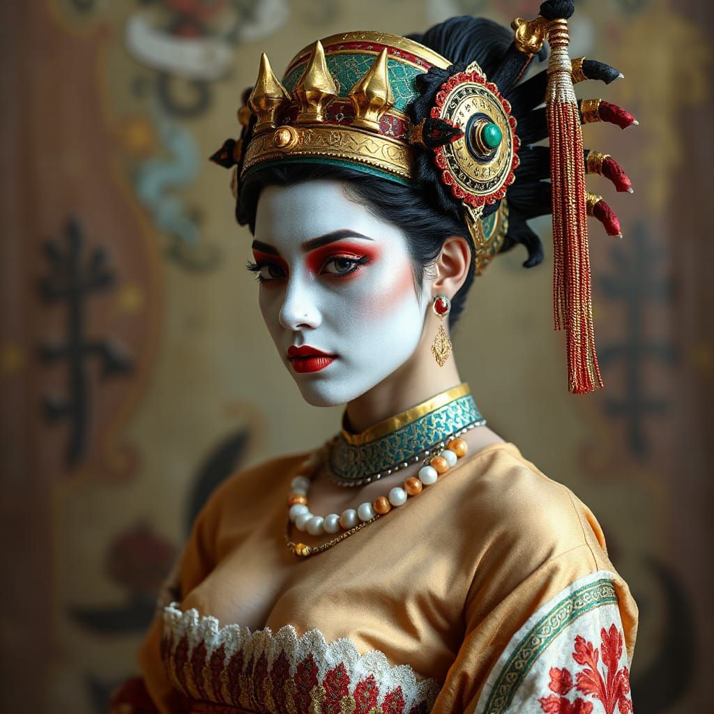 A detailed, photorealistic medium shot capturing a striking fusion of Geisha, Harlequin, and Egyptian elements with sharp focus and natural colors.