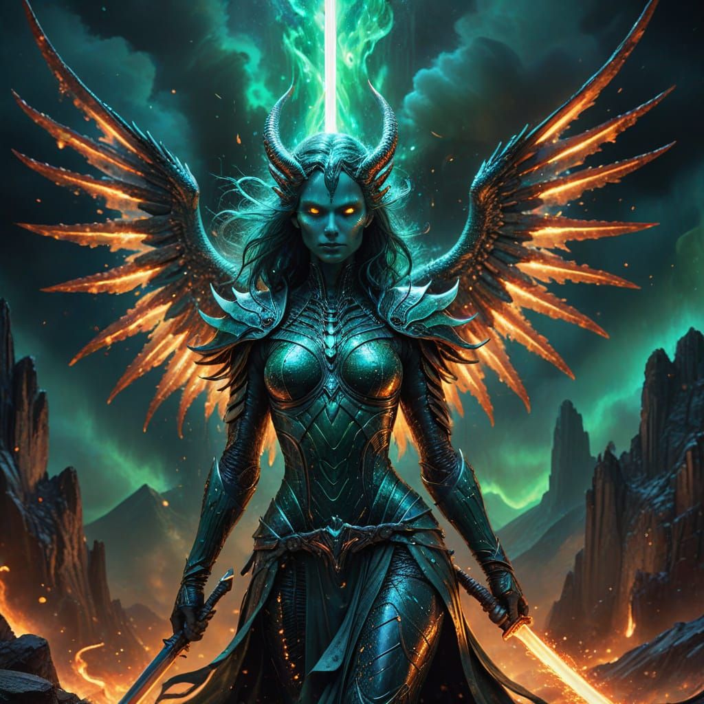 This vibrant, dreamlike image shows a majestic woman with scaled skin and enormous wings standing atop a mountain, holding a flaming sword and surrounded by cosmic dust and ethereal lights. Created in the style of H.R. Giger and Greg Rutkowski, this surreal street art piece features ultra-detailed, high-...