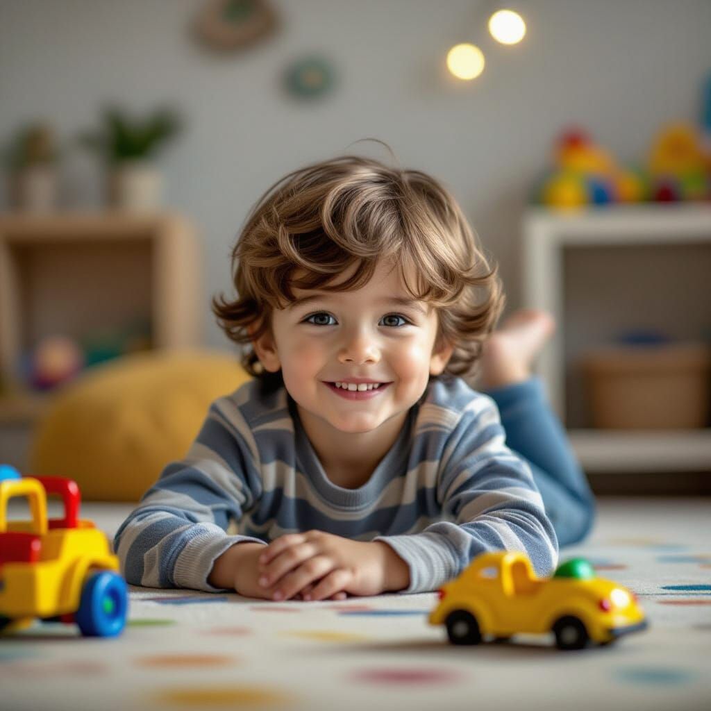 This image shows a vibrant, modern child's room filled with colorful toys and furniture. A happy child is featured in a close-up portrait with a bokeh background, captured in a sharp, high-resolution professional photography style.