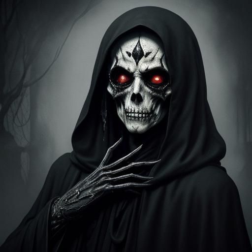 This image shows a frail figure in a black gown and porcelain mask. The concept art features warm chiaroscuro lighting, deep shadows, and high contrast in a hauntingly lit, ghoulish atmosphere.