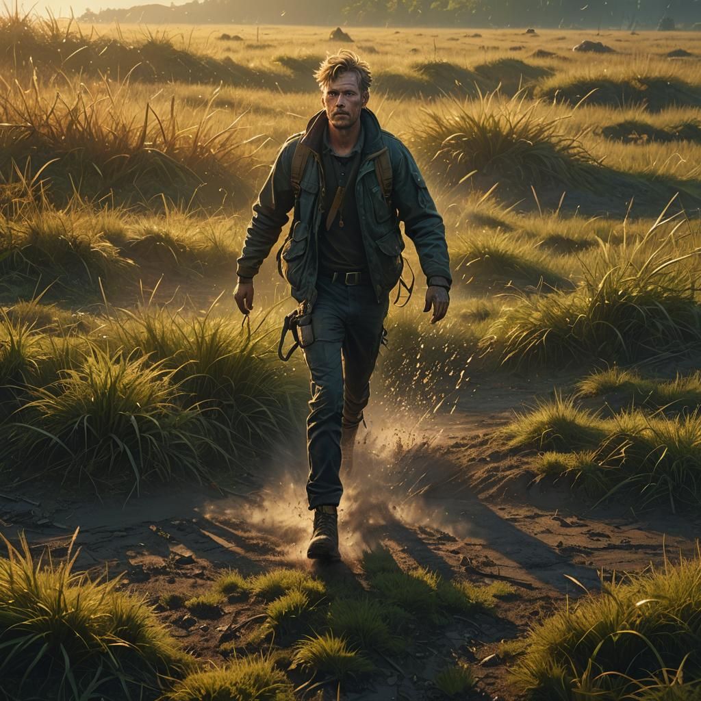 This image shows a figure named Adam emerging from the ground in a dramatic, cinematic scene with ground dust particles swirling around. It features macro photography-level textures, golden hour lighting, and vibrant colors, in a maximalist style.