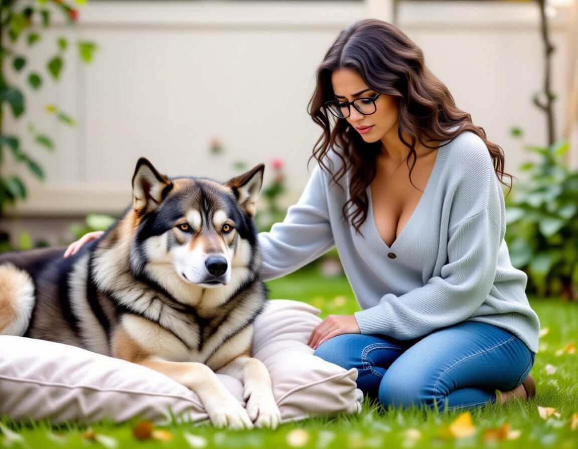 A poignant image shows a large wolf dog lying on a bed in a backyard, its eyes conveying sadness. A woman kneels beside the dog in the rain, her expression mirroring the animal's sorrow.