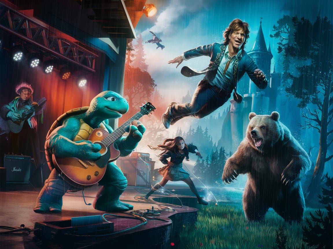 This image depicts a surreal scene with a turtle playing guitar on stage, Mick Jagger flying, and a girl battling a bear in the rain. The digital art features a vibrant triadic color scheme.