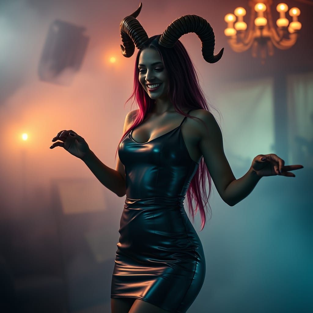 A hyperrealistic image of a beautiful faun woman dancing in a misty studio. She is wearing a latex minidress, with intricate details, vibrant colors, and moody lighting.
