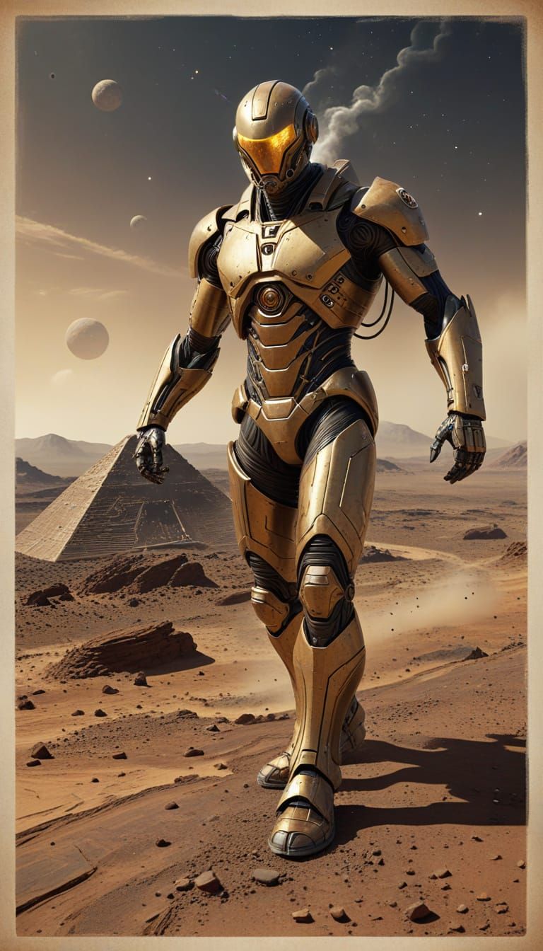 This image depicts a cyborg superhero approaching the famed Face on Mars and a five-sided pyramid on the Cydonia Plateau, set against a backdrop of stars and dust devils.