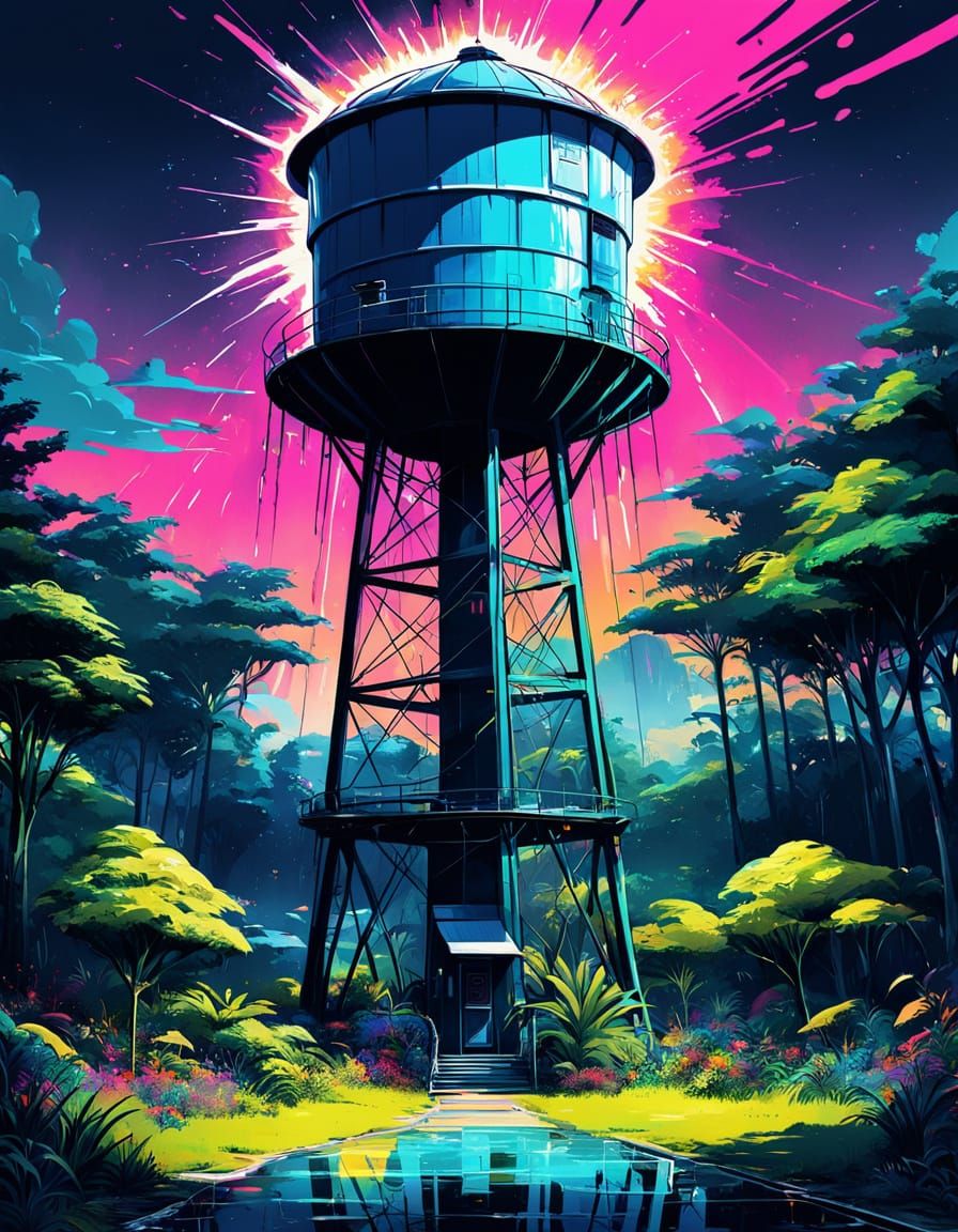 This image shows a vibrant graffiti artwork depicting gardens and a solar-powered water tower. The piece blends splash art, street art, and paint textures in a colorful, high-contrast synthwave aesthetic.
