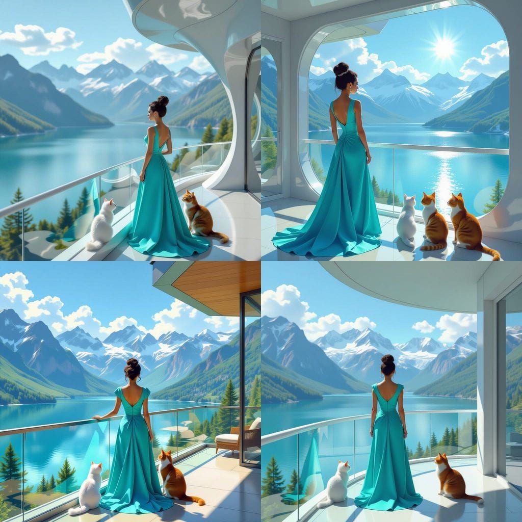 A woman in a turquoise dress and two cats stand on the balcony of a futuristic house overlooking a sunny mountain lake.