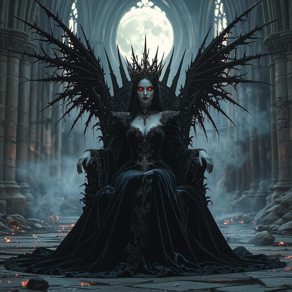 This image shows a gothic queen on a throne of thorns in a ruined cathedral. The figure is in a tattered gown with silver embroidery, glowing with ember-like luminescence.