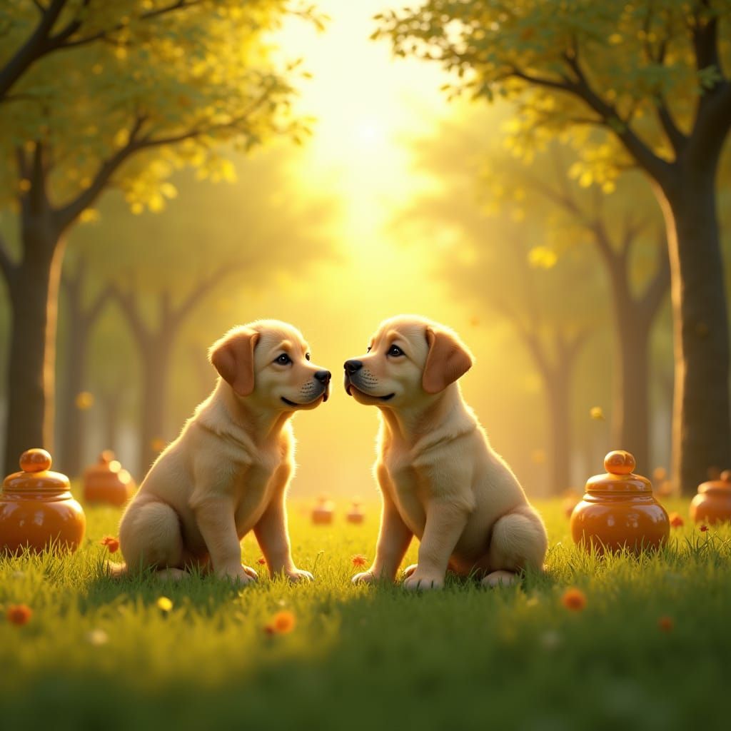 This image depicts a whimsical scene of golden Labrador puppies in a lush green forest, surrounded by honeypots under trees, with a focus on their fascination for honey. Created in a Pixar-inspired 3D digital art style with vibrant colors and cinematic lighting.