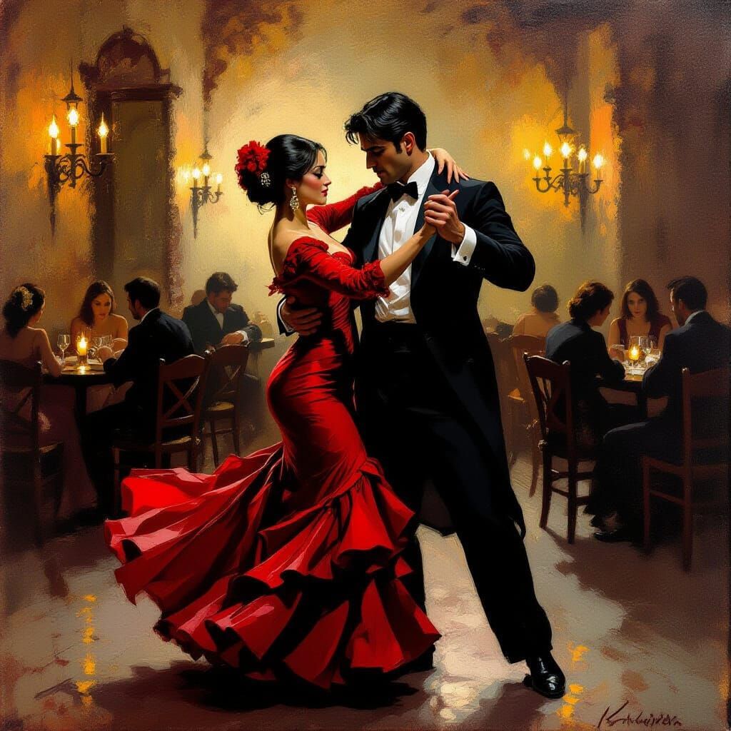A man and woman in traditional attire share an intense flamenco dance in a dimly lit bar, illuminated by flickering candlelight, evoking a romantic, expressive artistic style.