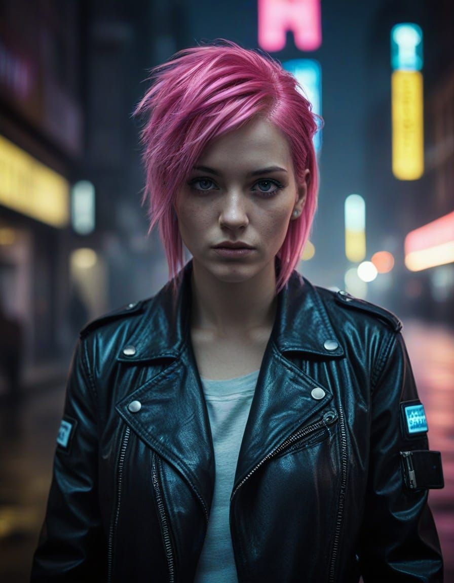 This striking image captures a defiant woman with vibrant pink hair and glowing cybernetic implants, set against a backdrop of neon-lit city streets with a moody, high-contrast aesthetic reminiscent of classic film noir