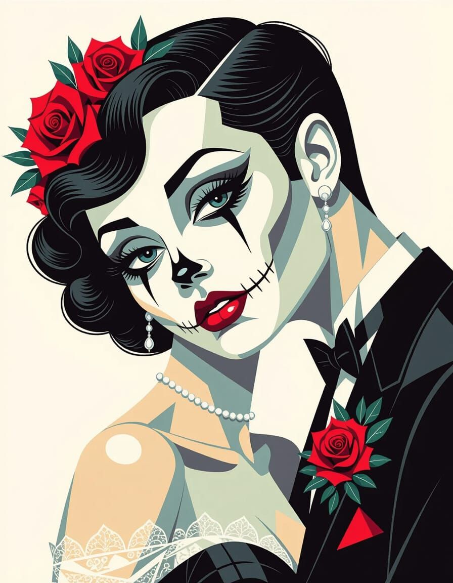 This image shows stylish undead dancers at a prom, with creepy corsages, rendered in a geometric Bauhaus style with intricate details and a moody atmosphere.