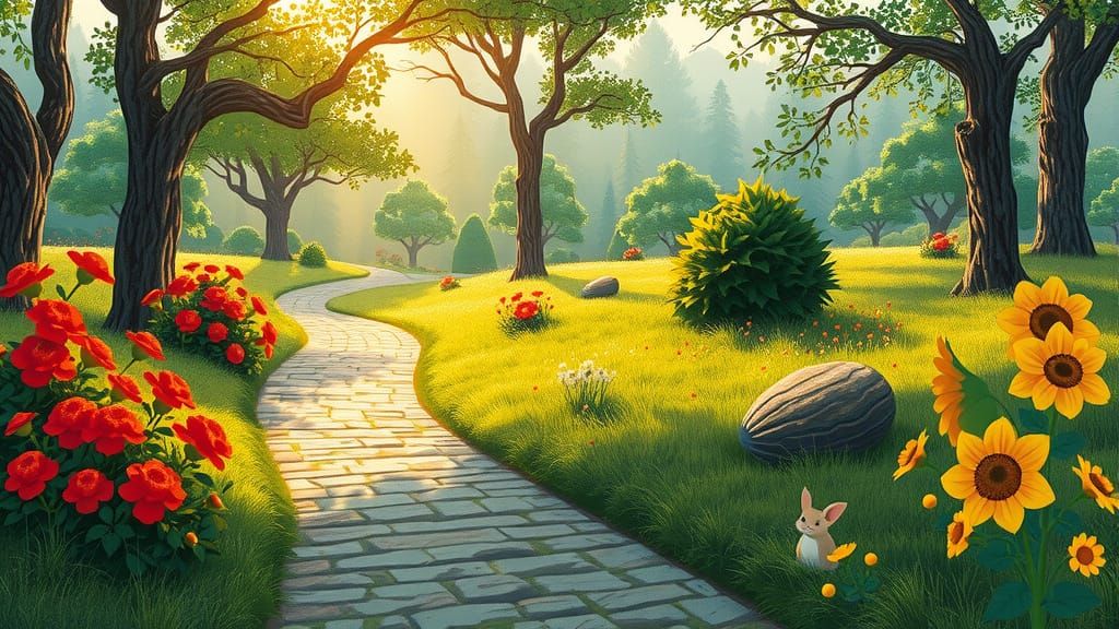 This image depicts a charming cobblestone path winding through a forest, adorned with red and yellow flowers. Dappled sunlight creates a warm glow in a whimsical illustration style.