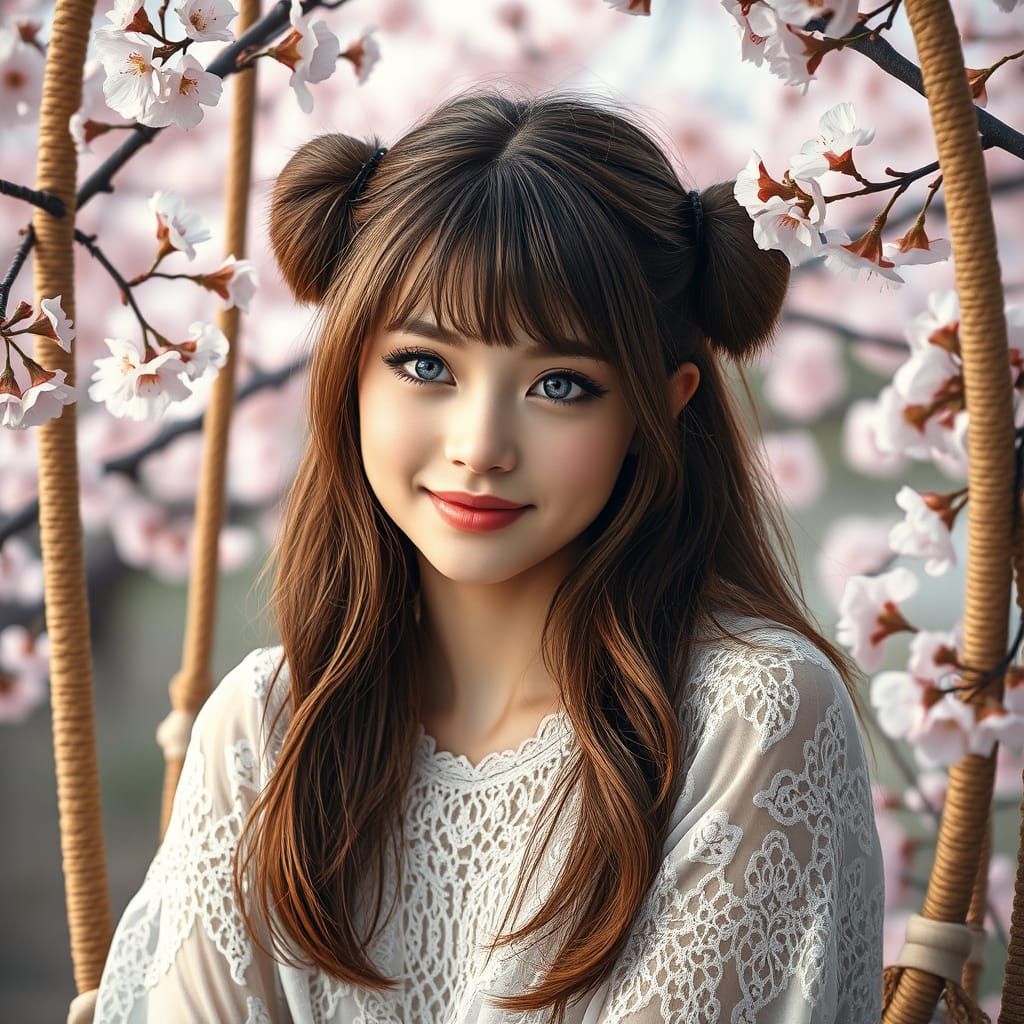 A serene woman with brown hair sits in a hanging chair surrounded by blooming cherry trees. She wears a white lace dress, complemented by professional makeup, in a sfumato art style.