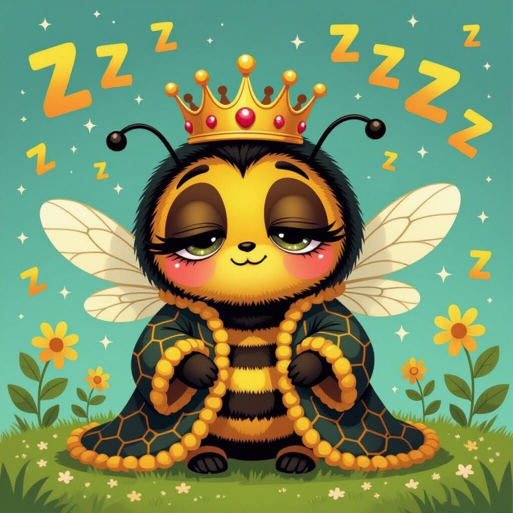 A whimsical caricature of a tired queen bumblebee wearing a robe and crown. The image features exaggerated expressions and art nouveau curves against a background of floating zzz's.