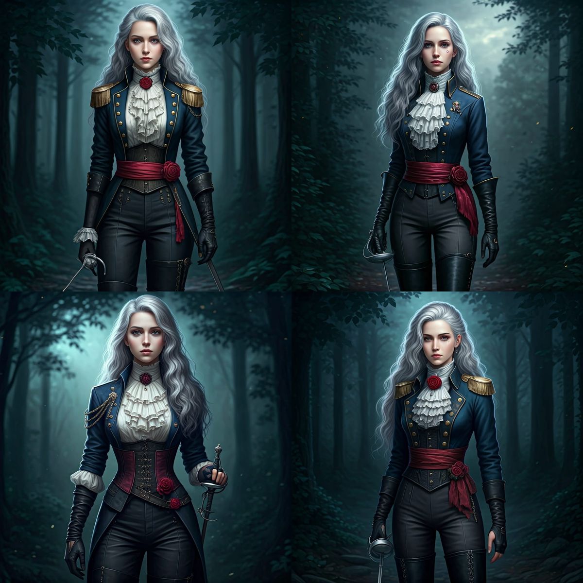 A captivating image of a teenage girl embodying French aristocratic elegance and fencing prowess. Dressed in a Rococo-meets-military style, she exudes both nobility and readiness. The twilight forest enhances the scene's mystique.