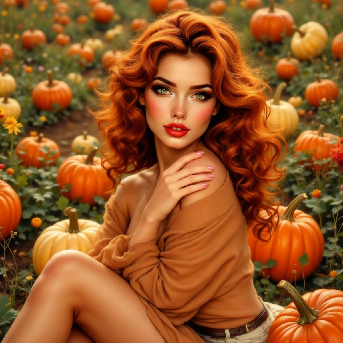 A hyper-realistic illustration of a confident, mischievous woman with red hair in a pumpkin patch, inspired by 1950s pin-up art with lush brushwork and vibrant colors.