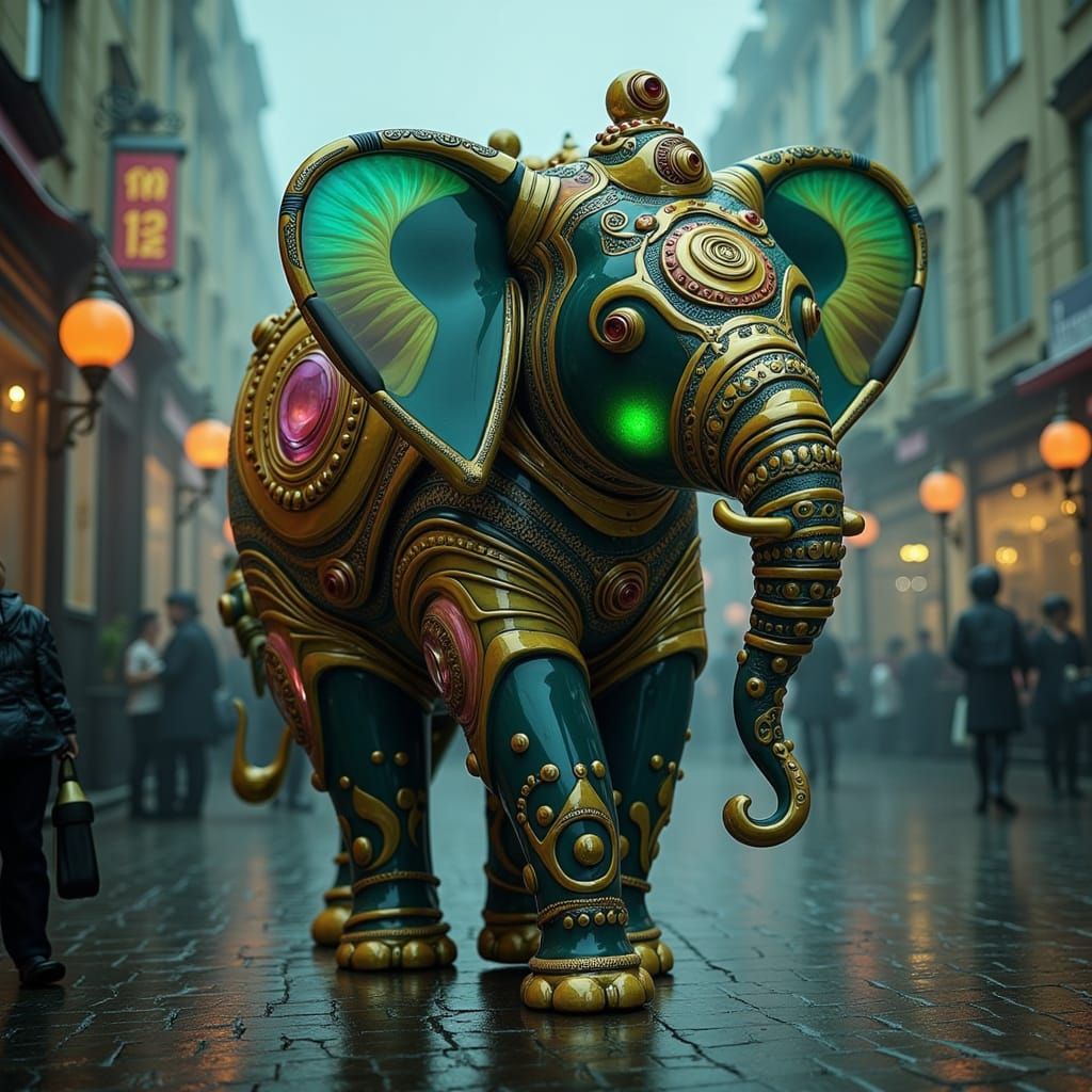 This image shows a detailed digital painting of a steampunk elephant with brass gears, set in a foggy Victorian London street illuminated by gas lamps. The style is fantastical with a rich, atmospheric color palette.