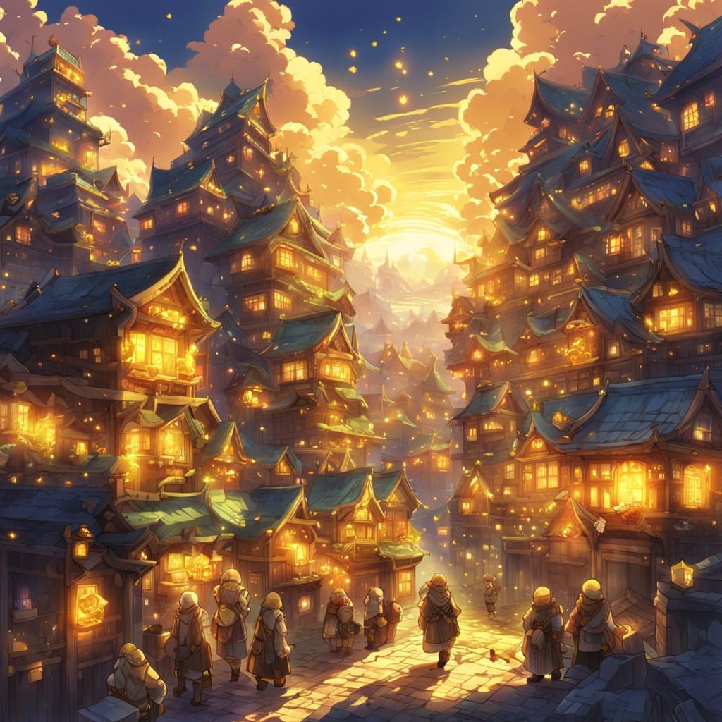 This image shows a vibrant anime-style fantasy city populated by dwarves. Yellow crystals illuminate the scene, and the roofs gleam in the soft, warm light.