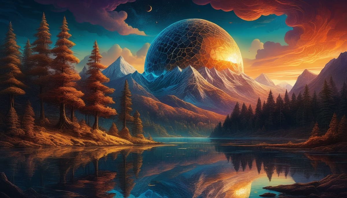 This image depicts a tranquil round lake surrounded by ancient, dome-shaped mountains during a golden hour sunset. Luminescent nebulae and glowing trees are reflected in the water, creating an ethereal, otherworldly scene with rich, saturated colors.