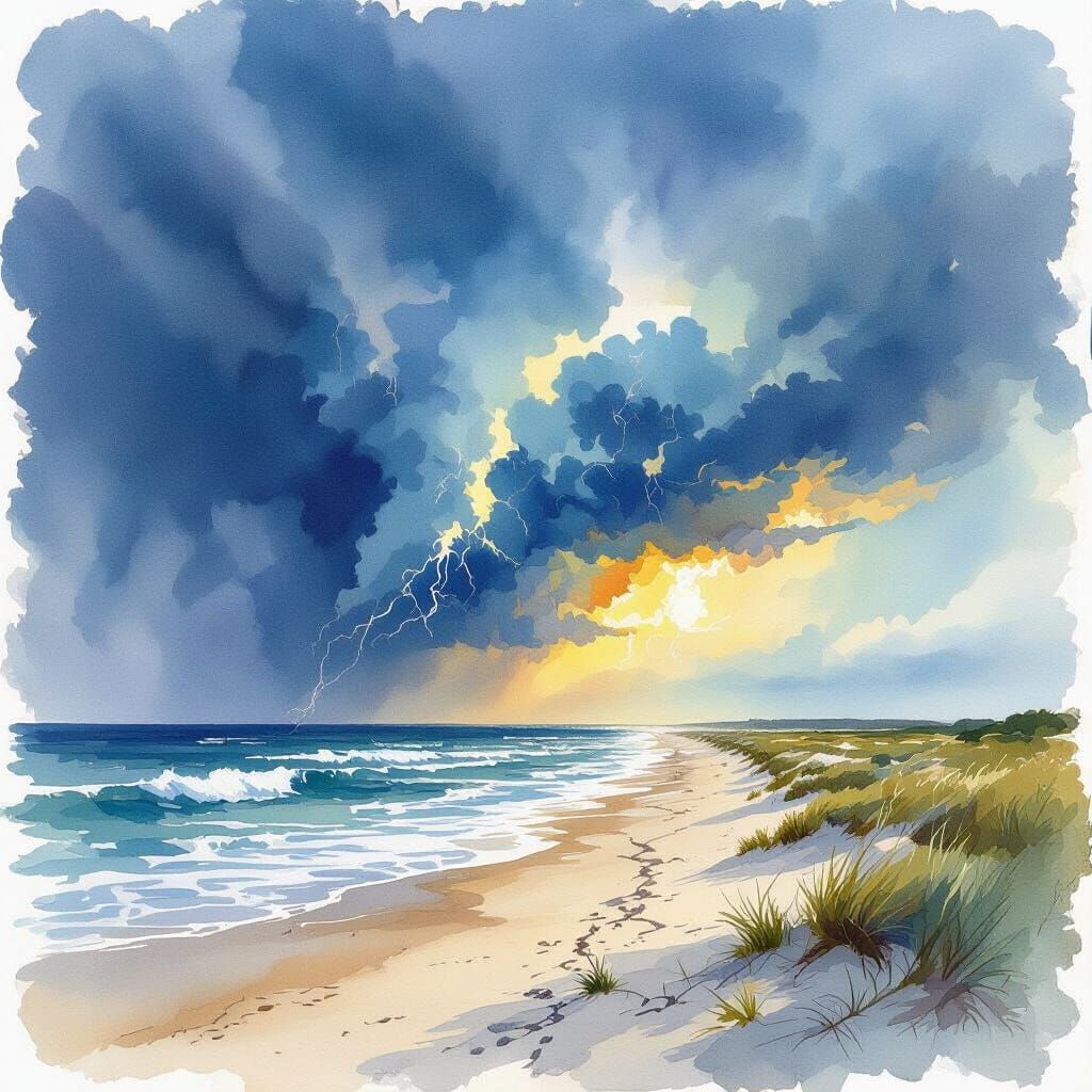 A watercolor painting captures the dramatic approach of a storm over the Outer Banks of North Carolina, featuring fine details and complementary colors in an abstract style.