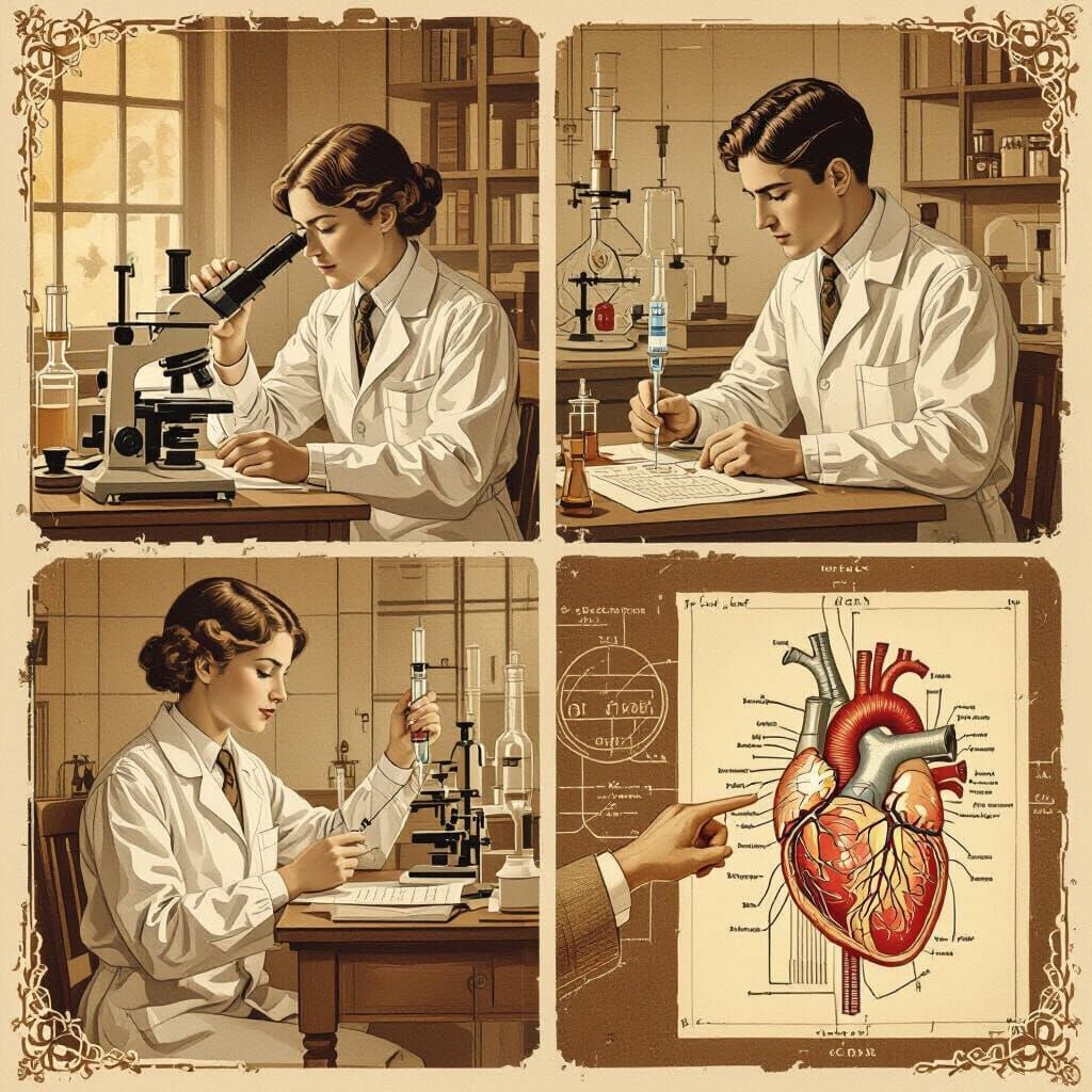 This image shows students in a vintage lab discovering key moments in medical history. The scene is rendered with intricate lines, warm earthy tones, and vintage textures, in a style reminiscent of botanical illustration.