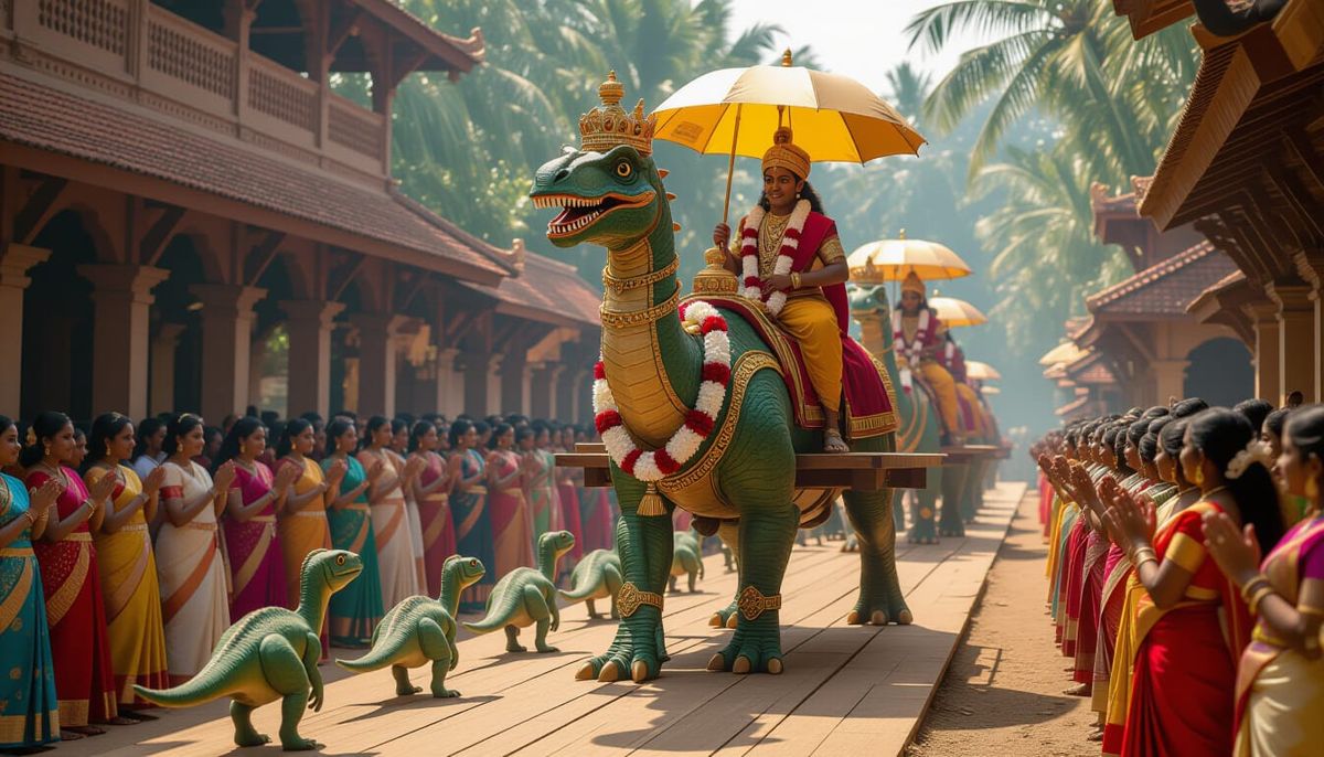 This image shows a dinosaur in regal attire being carried on a platform. Smaller dinosaurs bow in respect during a parade with vibrant colors and whimsical elements, in a traditional Kerala aesthetic.