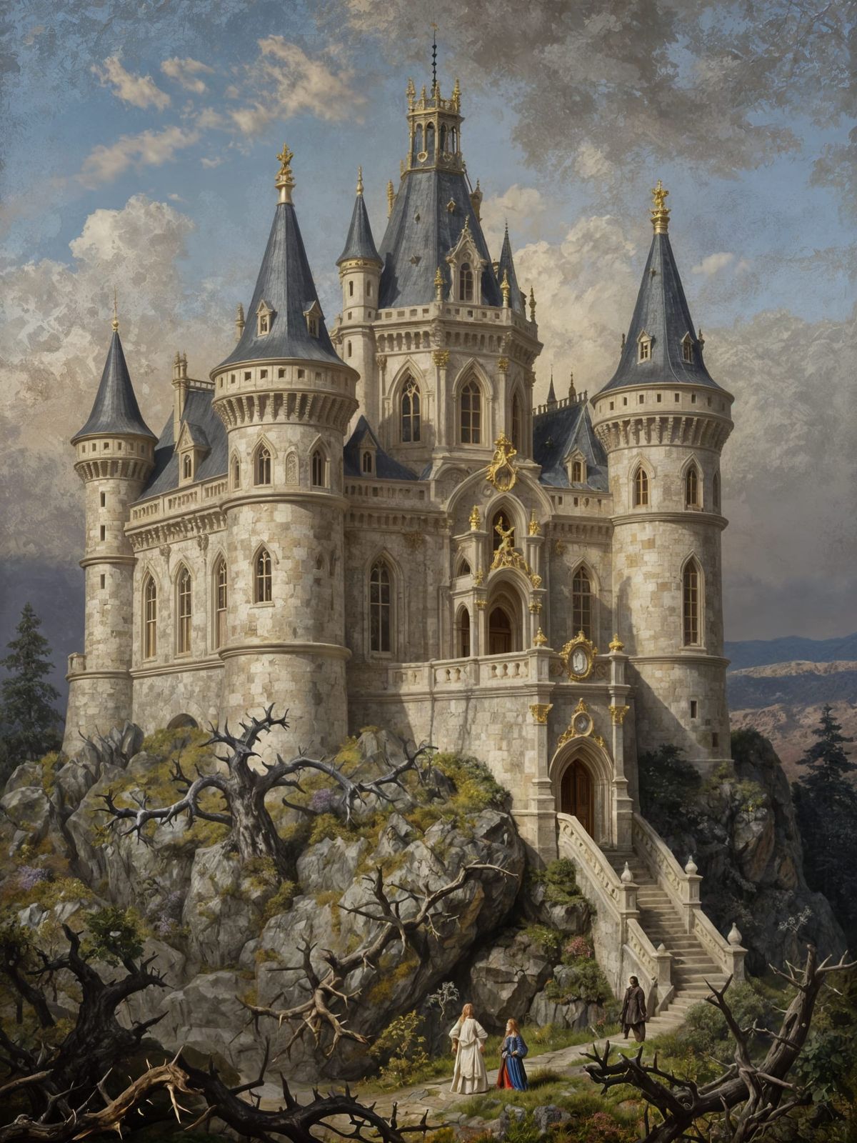 An intricate detailed “medieval stone palace castle stronghold” built on a natural rocky thorn hill, surreal gorgeous, a very intricate and hyper-detailed oil painting by Erin Hanson, Albert Bierstadt, Eve Ventrue, Ferdinand Knab. volumetric lighting, gorgeous, ornamentals, elegant contrast, photorealistic, ...