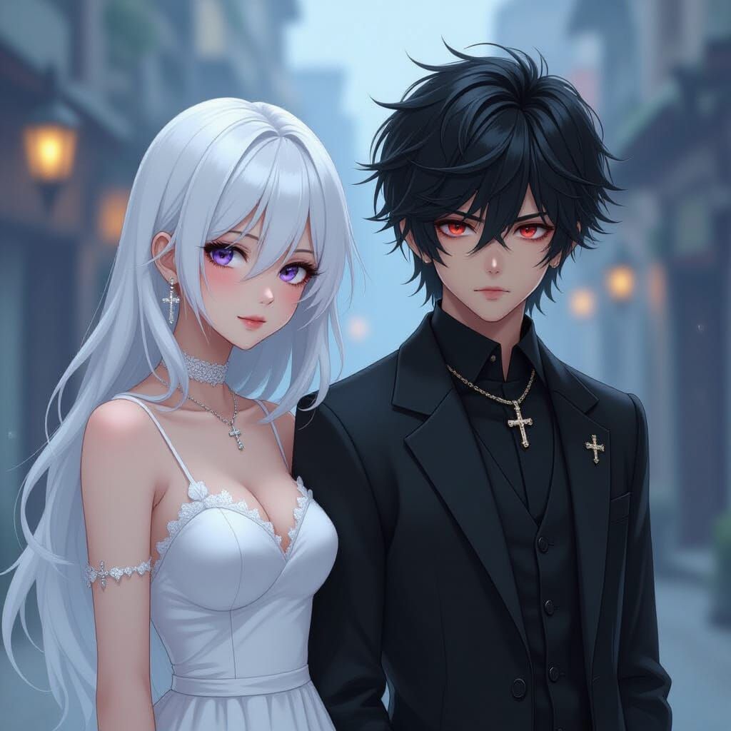 A striking image of a girl with white hair and a boy with black hair and red eyes, set in a mysterious, dark, dystopian world with dramatic lighting.