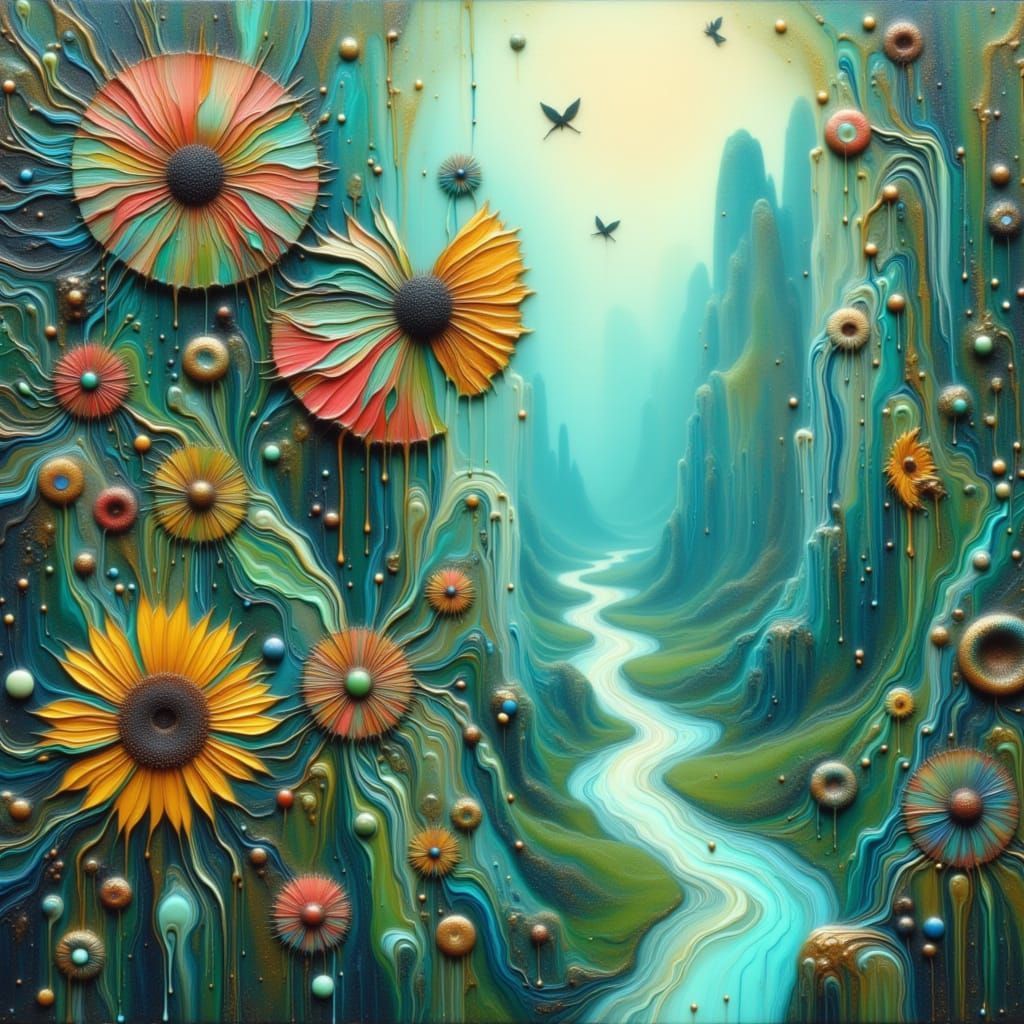 A vibrant scene of exotic flowers on a cliffside above a winding river valley. The image evokes a dreamy aesthetic, blending organic textures with surreal elements in a vibrant color palette.